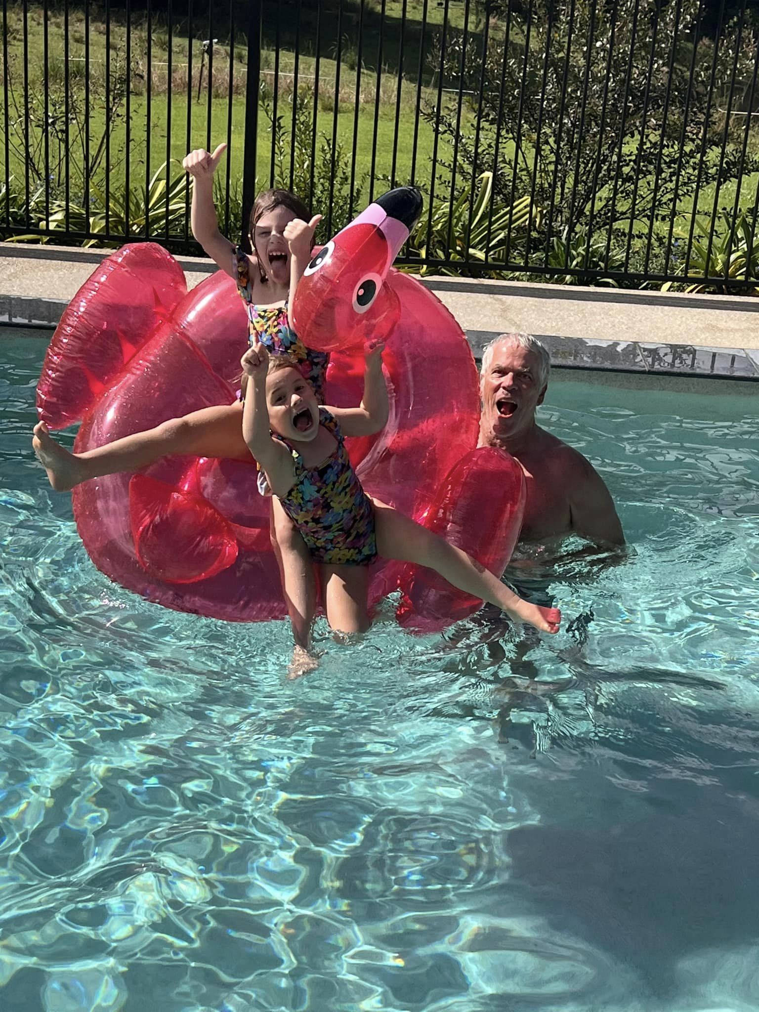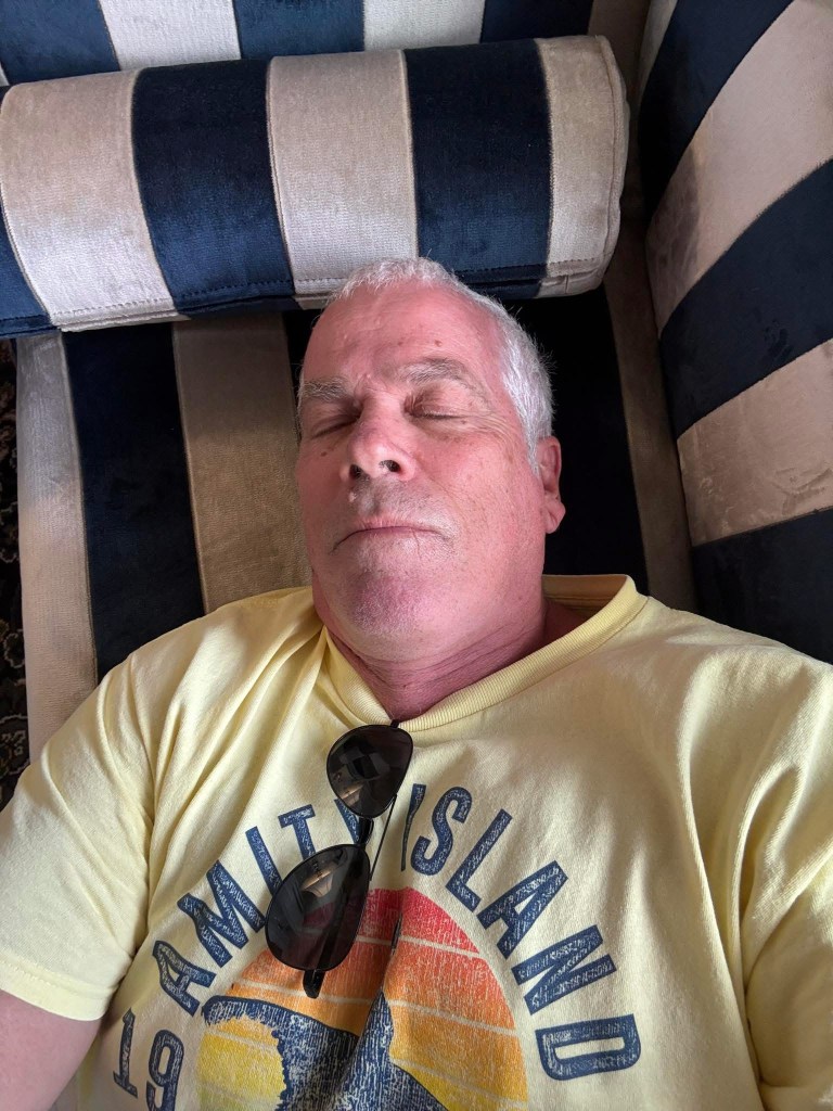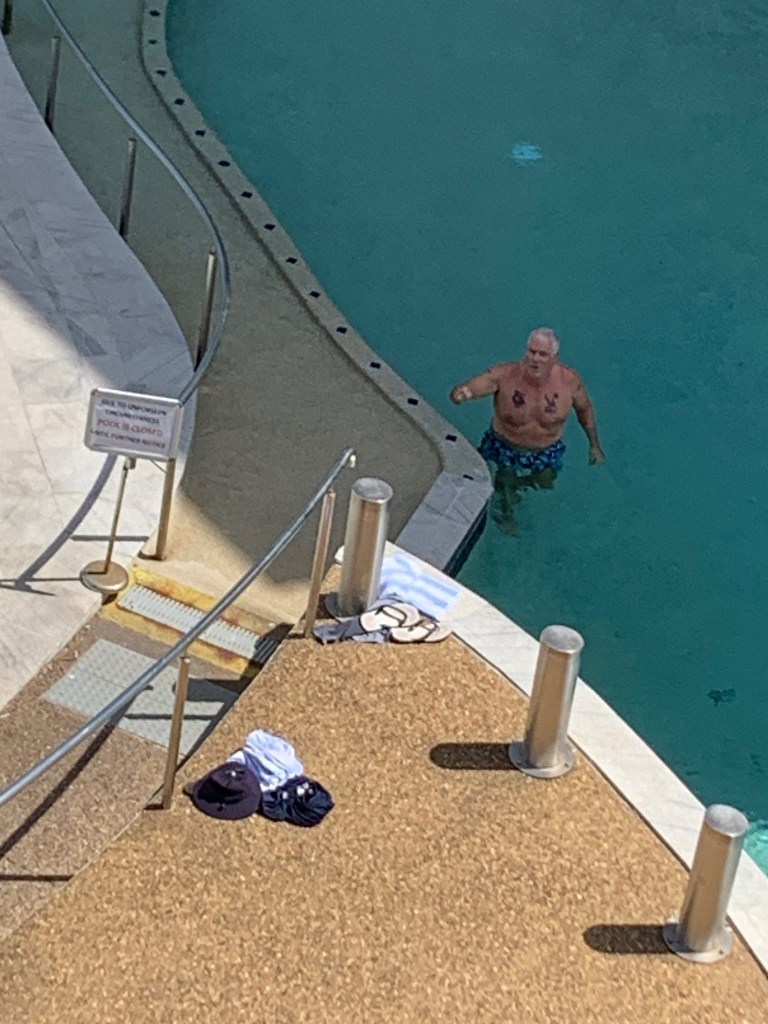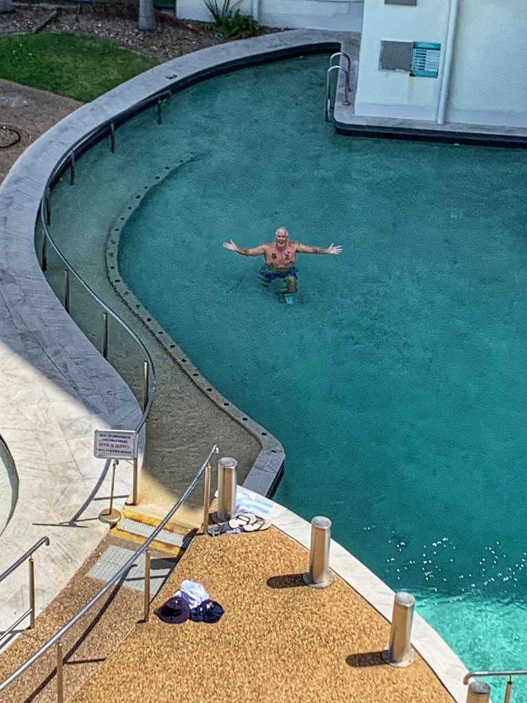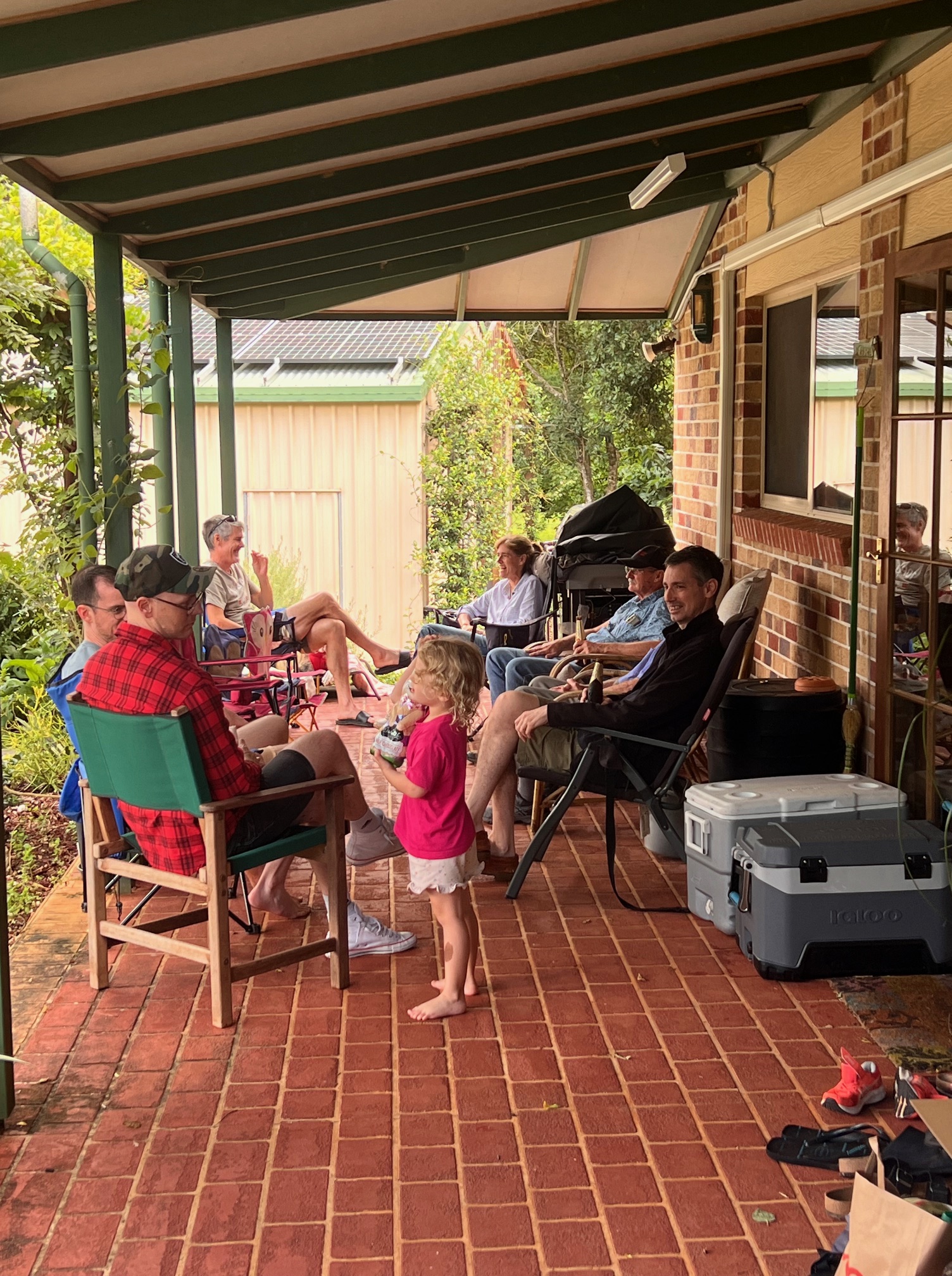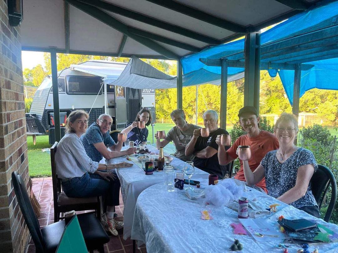 Everyone behaved themselves and retired for the night as the big day was still to arrive. Some rain during the night but woke again to a good day so went ahead with Plan A – get to that bloody chair before that dog! Another swim and then set up the outdoor areas – eating and drinking . This could catch on