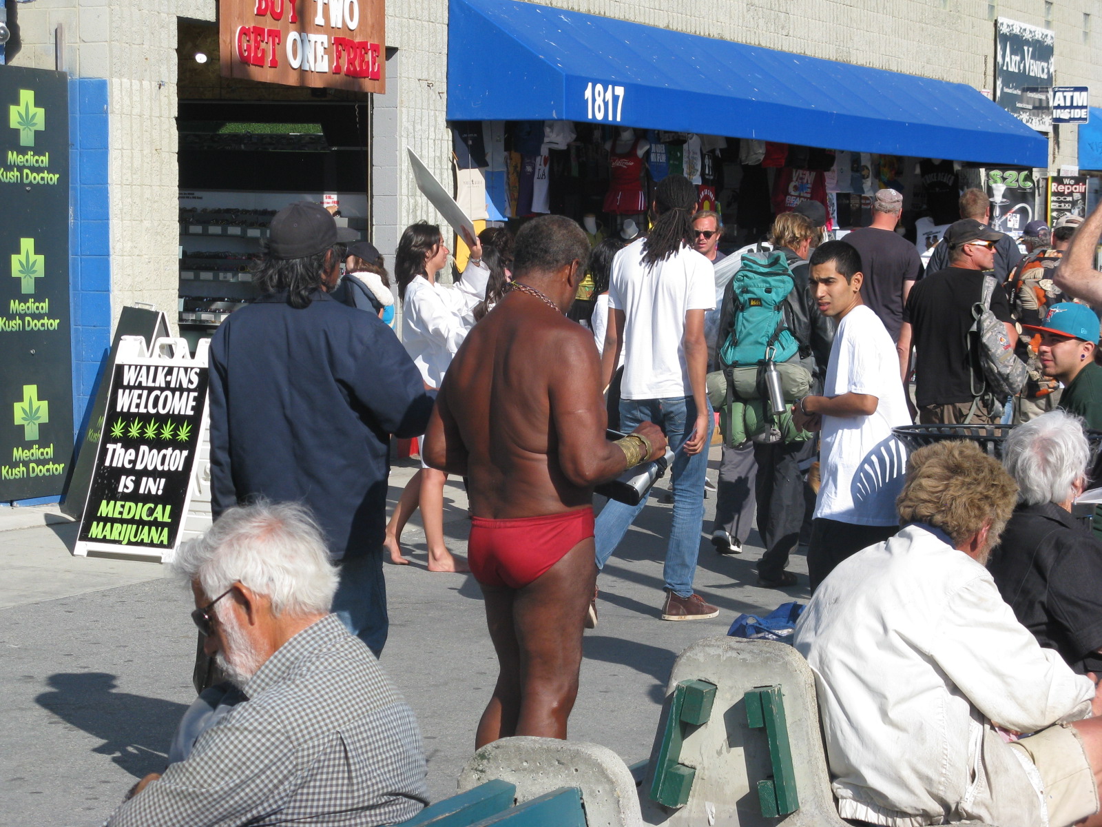 There was still a lot of daylight left on this glorious day so thought lets head down to Venice Beach. Unlike the subway system in NYC and Washington the public transport here was a lot more difficult to line up so after a couple of buses and some walking we went for the taxi option once more. We had seen Coney Island somewaht deserted on a glorious day but there were plenty of people around the boardwalks here and doubt many of them paid taxes. The medicinal weed doctor seeemd especially popular and of course what is Venice Beach without the outdoor gym.