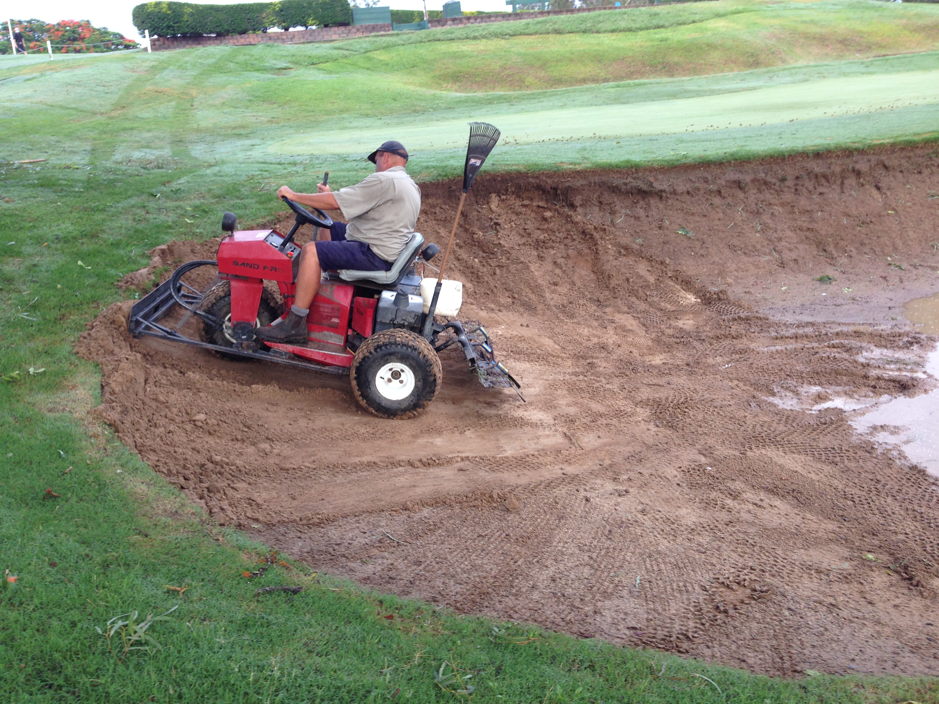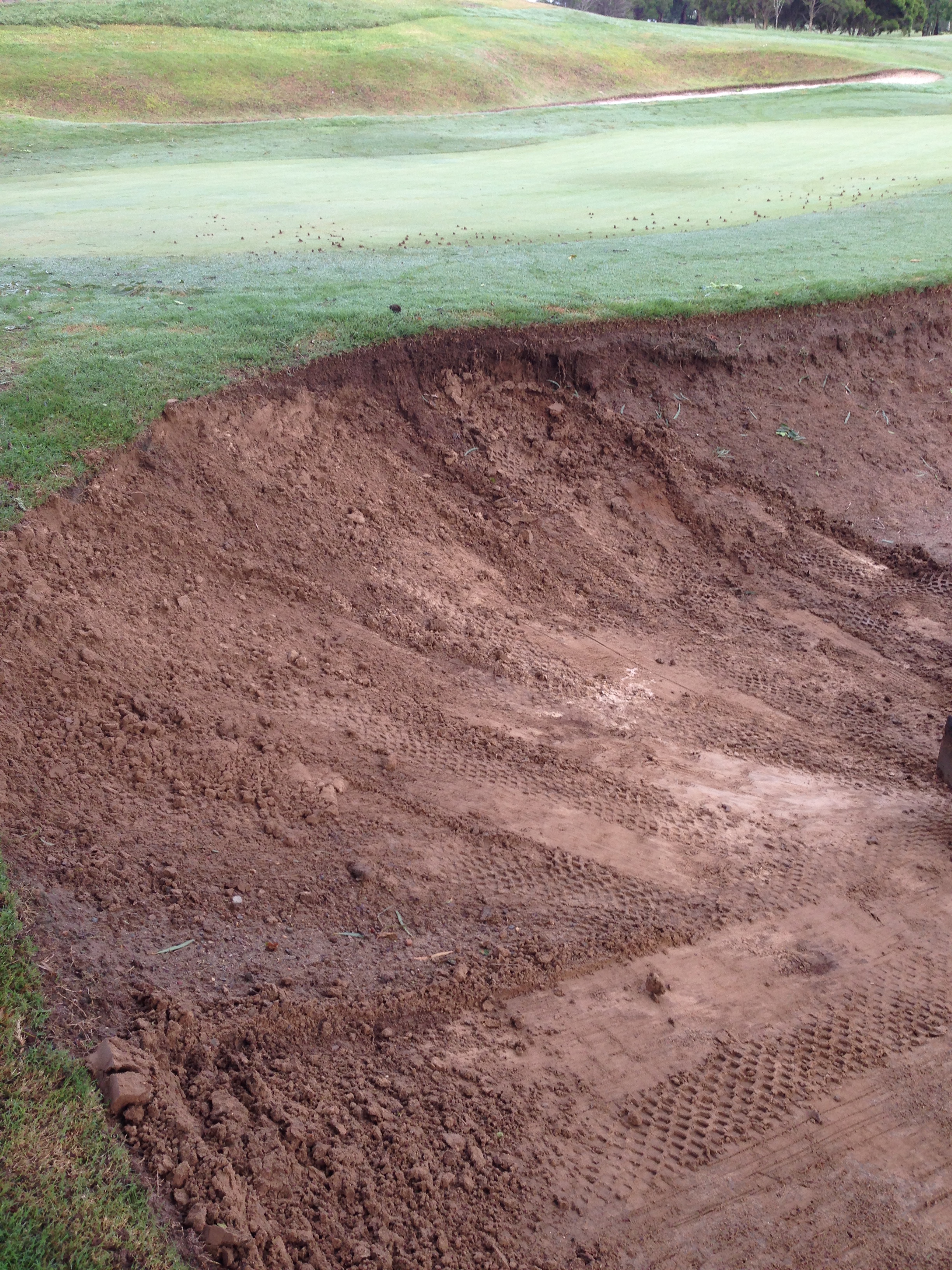 Most of week now is filled with either working on golf course or playing golf. Last Wednesday clearly demonstrated these two should not intersect. Once you get involved in projects then your interest raises and hard to switch off so wandered out early last Wednesday to just tinker around with a few things when the opportunity to fix the bunker on 9 came up so 3 hrs later it was done and I couldnt walk. Two hours after that I teed off in usual Wednesday group. You know how most pros would be pretty happy returning a -12 score? Apparently there is one event that does not apply – Standard Scratch! Ok, so no more work on mornings of golf. Of course after rain of last few days the good work has in part been undone. But this is what it looked like after Wednesday and before Noah started hammering away on Friday 😦