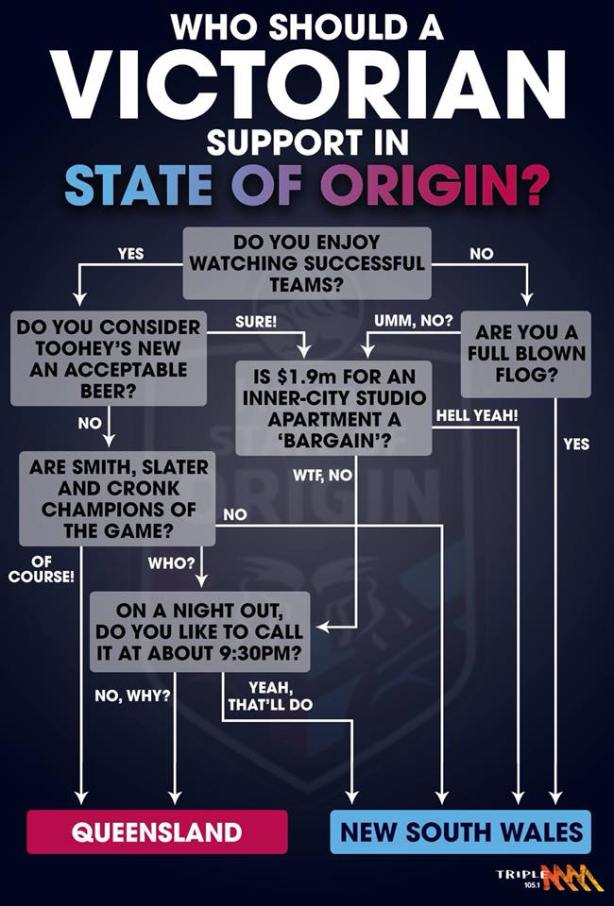 So, in other inconsequential news a lot is going on I guess. SOO approaches and while always thought this was the year we start losing even before Eyelash Boy bailed the side NSW has picked does give us an outside chance and by that I mean we could lose by 50 or win by 8. Its a side brimming with speed and talent but is inexperienced and if get behind early could be some panic. If NSW lose the first game, let alone the series, they will be in the foetal position for years to come. Of course with first game being in Victoria we need to help that mob work out their allegiance