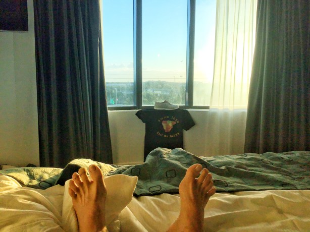 Arrived at second detention camp – known locally as Stamford Plaza – at 10 am and very pleasantly surprised to see we could get to our room straight away. Time then to hit the pool for a chill and dip