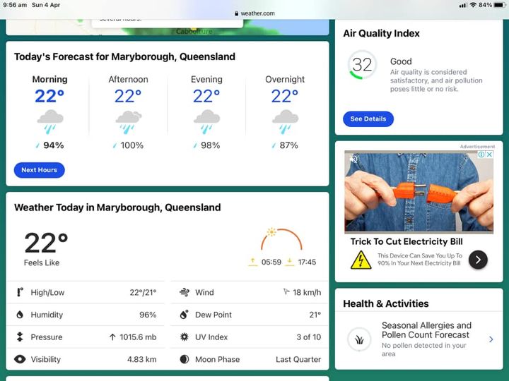 So, I hattened down the batches and closed the house up and assumed the fetal position on top of sheets in trakkies and T shirt in case I had to swim down the road at some stage. By midnight the quiet was somewhat eerie. By 3am I was just getting a tad pissed off so quickly checked BOM map on phone and ” hey look there is that big blue rain bomb already well off shore and heading to Fiji”! Basically it was a decimal point issue and only out by 2 spots and 100 k ie 1.2 mm actually fell in Maryhole.
