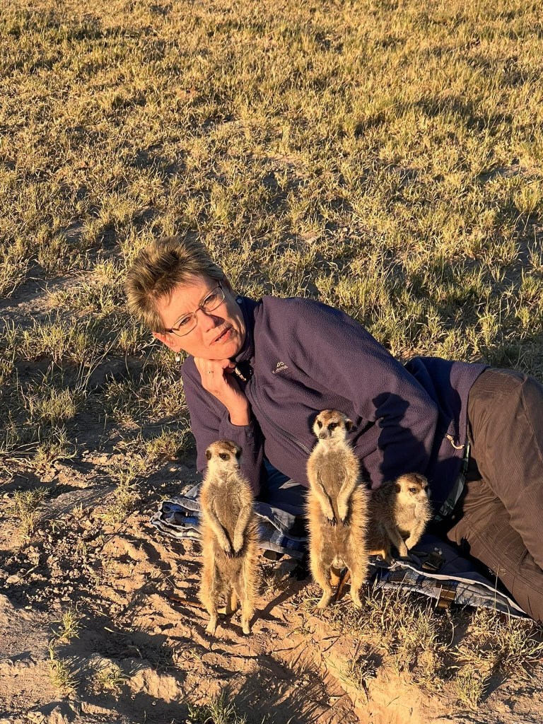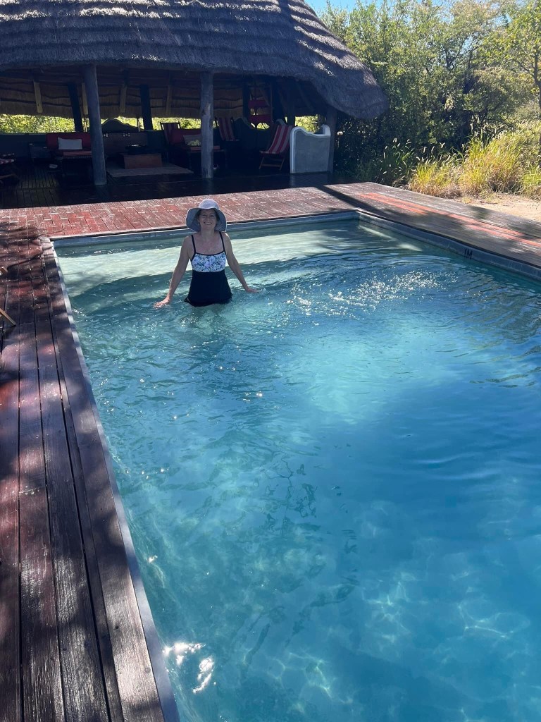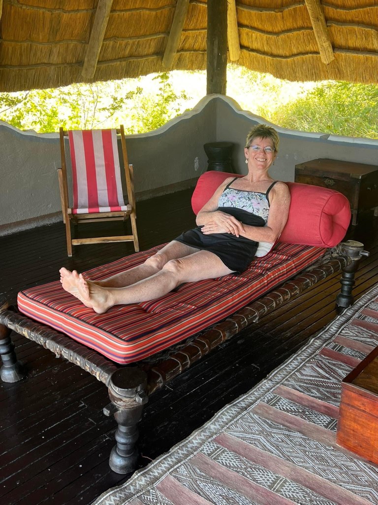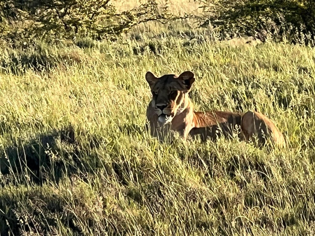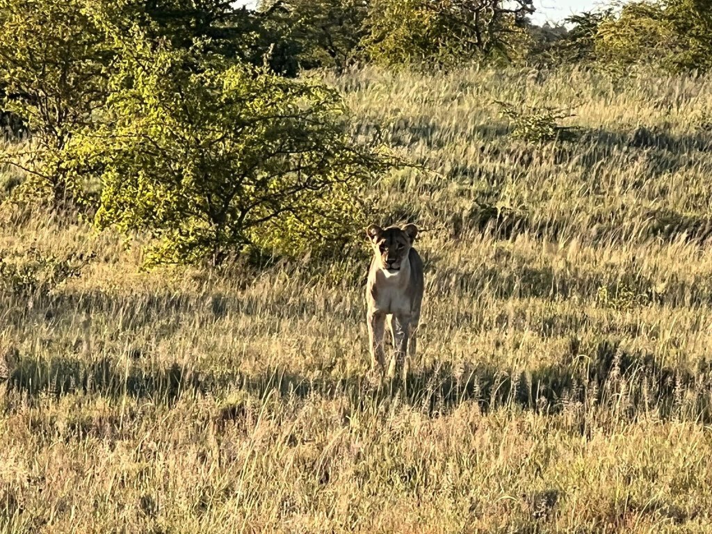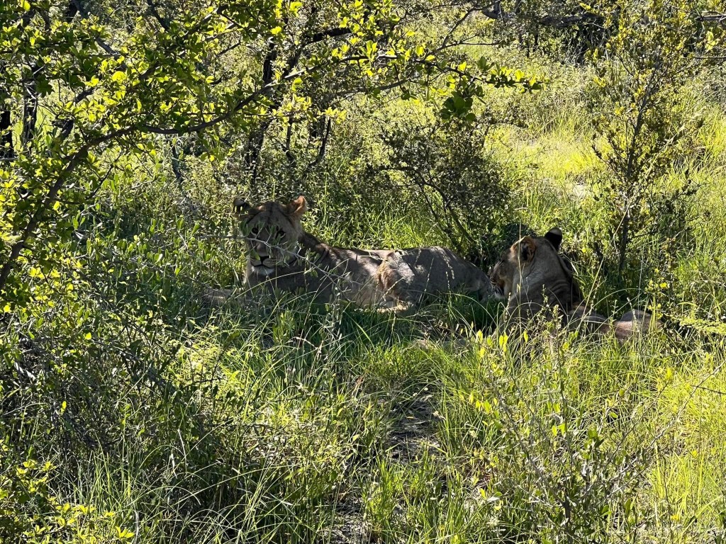 Pretty good nights sleep as a bit cooler . They wake you at 5 am – 4:45 am it appears ! – with tea or coffee in your tent . Cups would be handy. Then down to the usual solid breakfast and mix with a few GU . Headed off at 6 am and it was cool and breezy . Today we search for lions and ear plugs for Deklerk lectures 😏 As at other camps the guides all work in well together and before too long we heard lions had been spotted – doesn’t that make them leopards 🥸 – and duly arrived to be simply enthralled . A mum and two cubs – going to be hard to top this folks