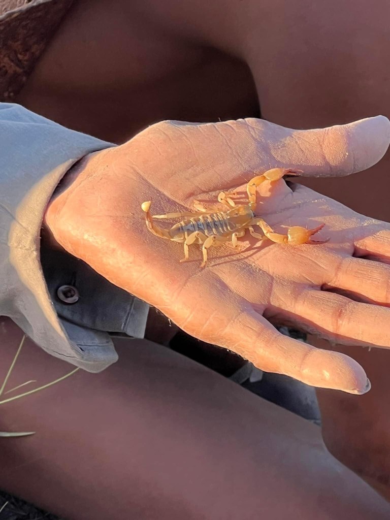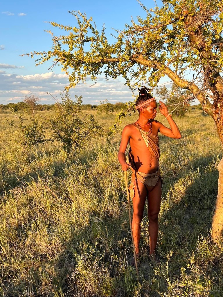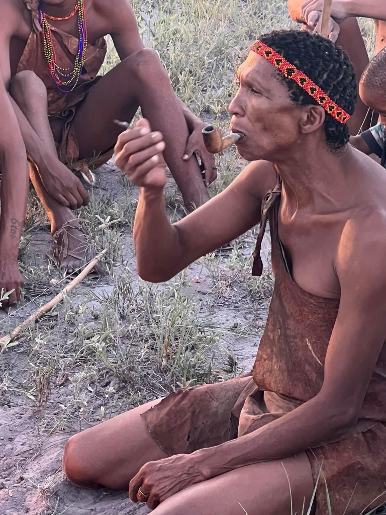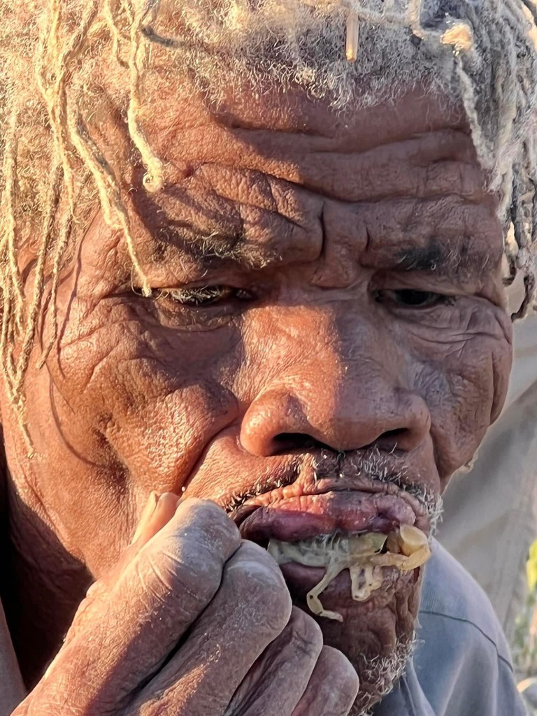 Lunch at 12:30 and then relax until 4:30 pm for High Tea and then having a walk with the Bushmen of the Kalahari at 5pm . The food at high tea is excellent . The 30 minute drive to the bushmen took the usual 45 min with Deklerk more interested in turning and talking to us. The minutia he goes into is impressive to him I am sure. Luckily we eventually arrived and it was a great 90 mins spent with the bushmen. And women. A slow deliberate walk full of highlights and fun . For the bushmen at least 🤓 Amongst many highlights was the old man cleaning the live scorpion in his mouth – which got stuck