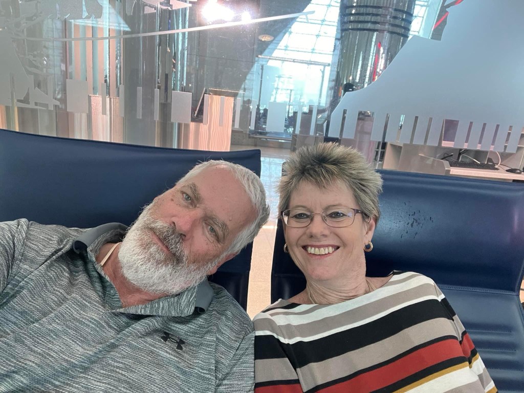When Emirates bought forward our first flight some months ago we were left with a pesky 8 hr layover starting at midnight in the Dubai Airport. Lounge access is expensive and really not going to hook in between midnight and 7 am so decided to opt for the 7-12 hr option at Dubai International at airport in what is know as the “High End Hooker Special “. Be amazed if get any sleep but at least a break from GU for a few hours. Once again not a lot of thought went into seats on flight as again at end of plane so last off, not that there is any rush at either end.