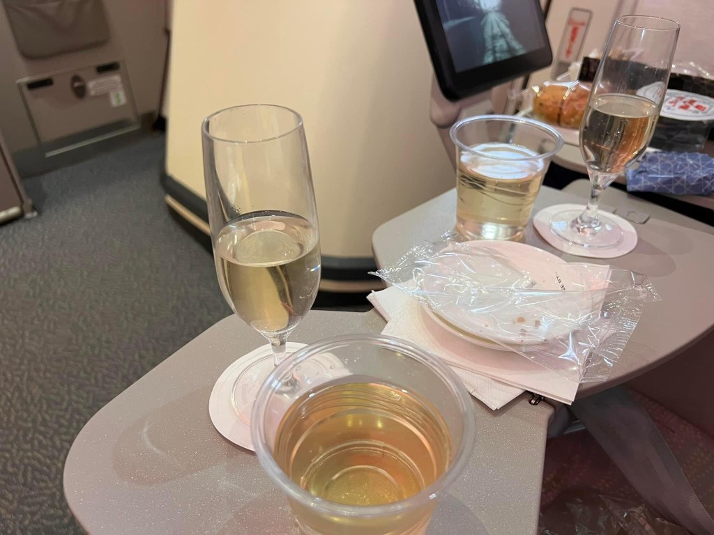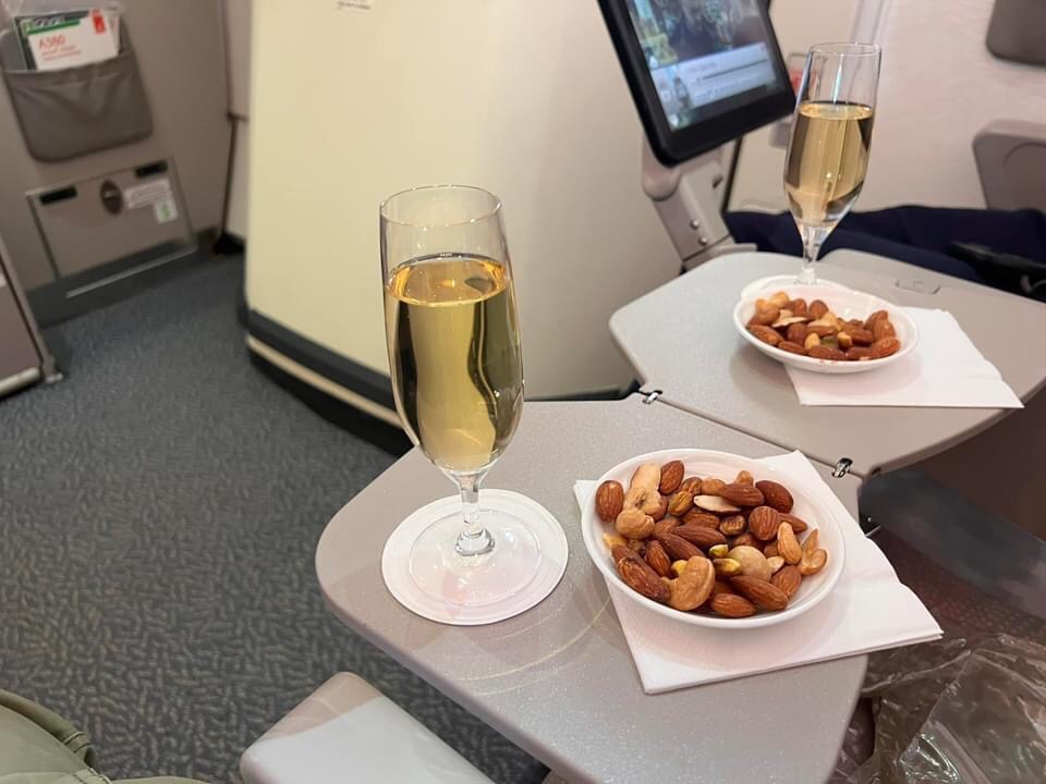So we had the prettiest A 380 certainly but one of the slowest sadly . The exit row seats this time were in better position or so as thought. The real sweet deal was plane only half full so while we looked like we might get away just the 30 mins late we actually sat on the tarmac for another 30 mins and then pushed back and waited another 30 mins while 45 planes took off in front of us ! Basically 90 mins late . We had always toyed with idea of 20 USD$ each for a small bottle of Moët Chandon and this seems perfect time to try as had great crew. Asked the male attendant and he said sure will put in fridge now . 90 mins later they were cool at least 😏 And warm peanuts as well and he put second bottle on ice 👍🏻 The best part of deal though was we got it 15 minutes after take off like in business class rather than with dinner so am sure the 12 other passengers in our section wondered what was going on. We then kept the flutes for other drinks . Then they bought out a plastic cup of wine as well #IBF . Pickled and 6 hrs to go.