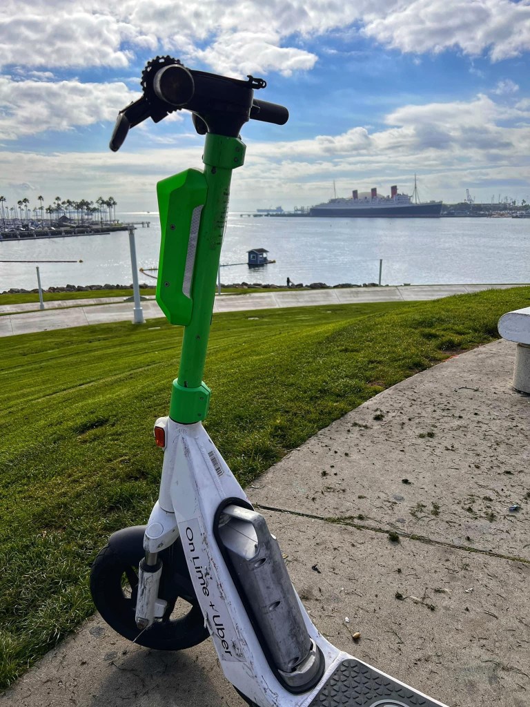 Now , my research had indicated for downtown Long Beach station it was a 40 min walk across a bridge to see Queen Mary , which it turns out is actually a big boat. Of course also knew about the free Passport Bus service that does the loop. Sweet . “ Ah no pal, that service only runs on weekends “. Hmm. Ok set off slowly when saw many Lime scooters . Well why not and scooted off towards bridge . Here is one I prepared earlier