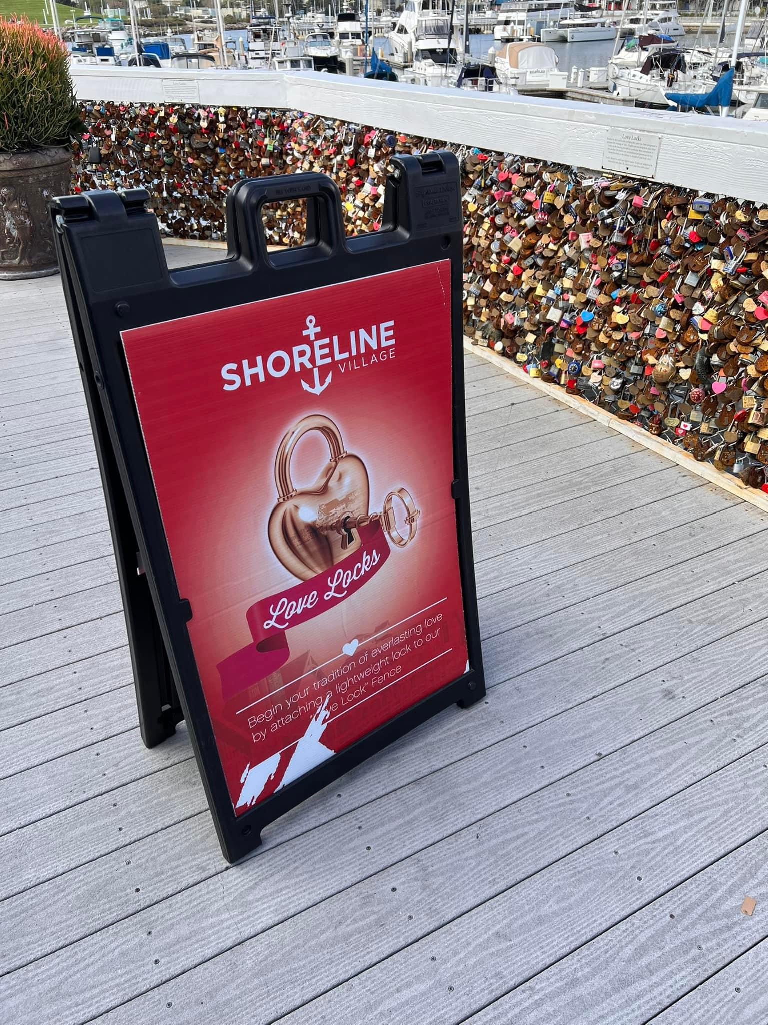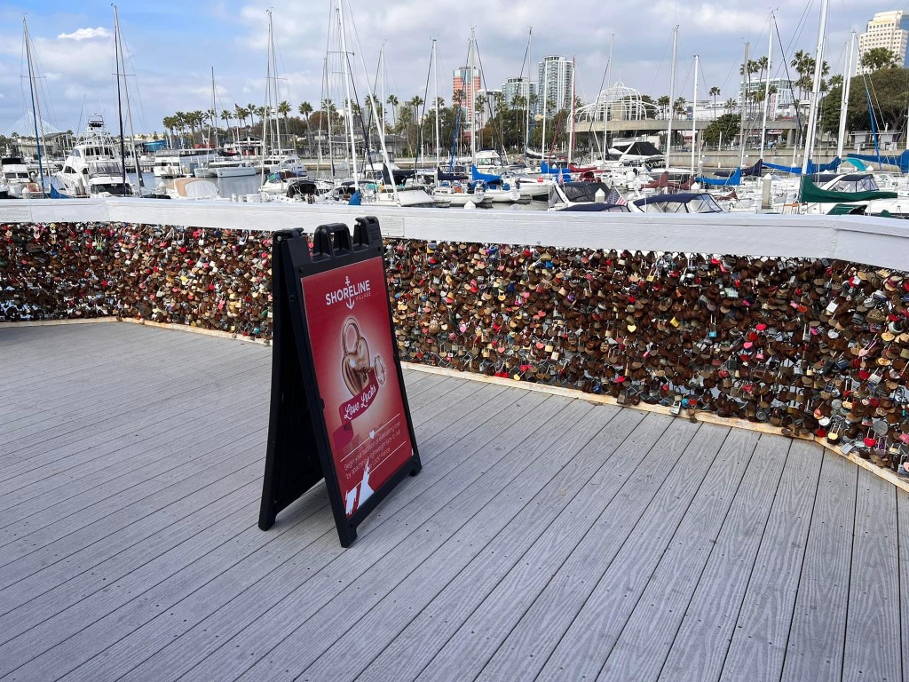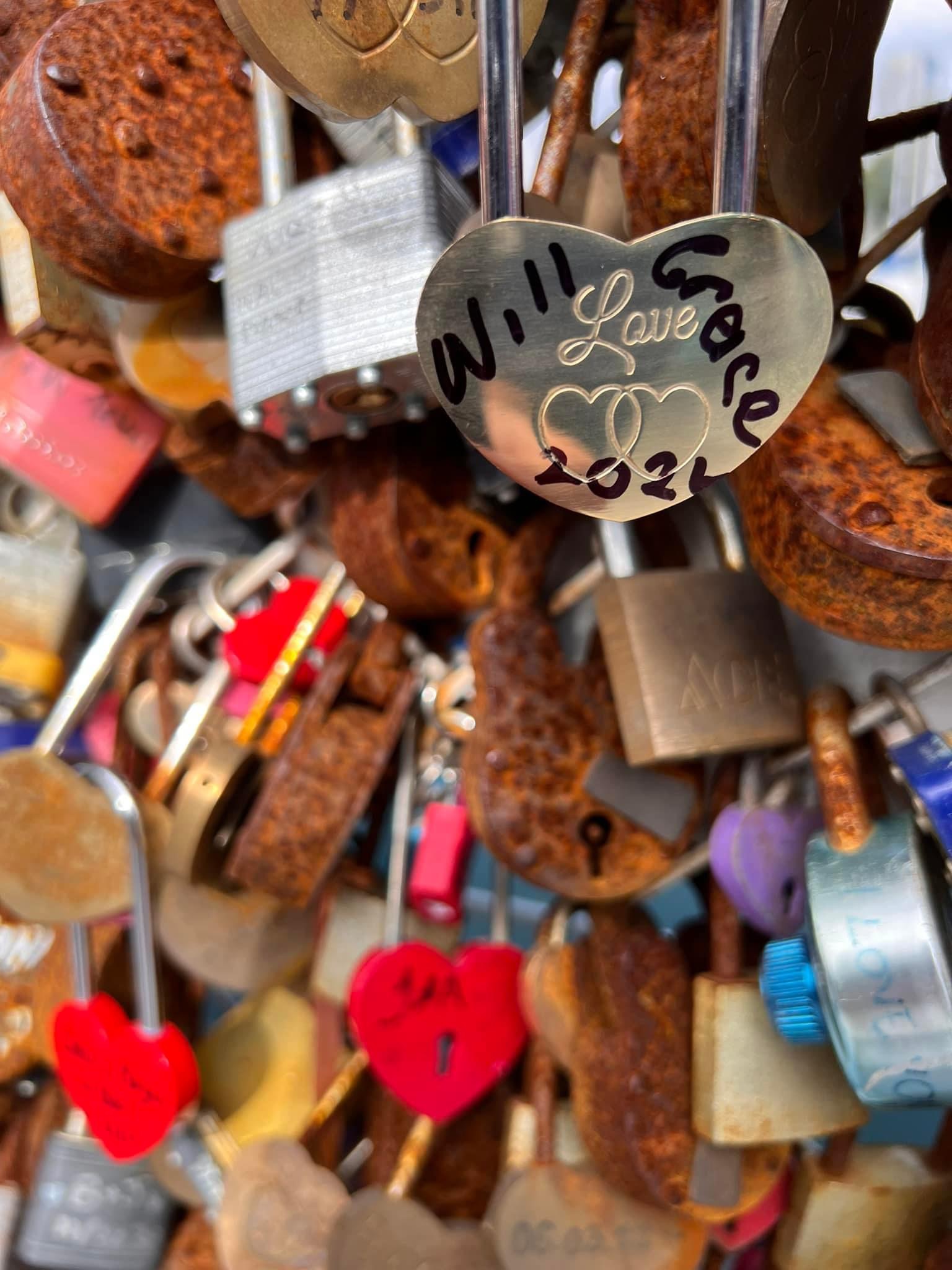 Time then to roll the dice if not the ankle and try a coffee at one of the marina shops. It is of course Valentines Day here now and while looking out over the water drinking my swill all alone it seemed maybe best thing was just find an anvil – there was an Anvil Shop – and some rope and jump in 😰 However when I went around the corner looking for a rope shop I found a lock bridge like the one in Paris only smaller and no Frogs around . It must have been a sign. Now I wonder who sells locks around here – could it be that store over there where the rose petals lead to 🤔 Bingo