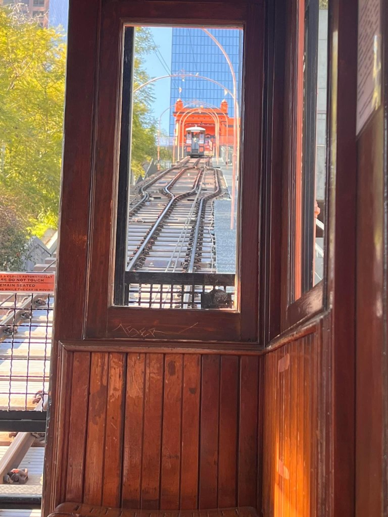 After a relaxing low key lunch and an hour rest in room headed out to check out some more known landmarks in the area on a glorious day. And find some milk – harder than you may think . First up though Angels Flight and then some shoulder exercises.