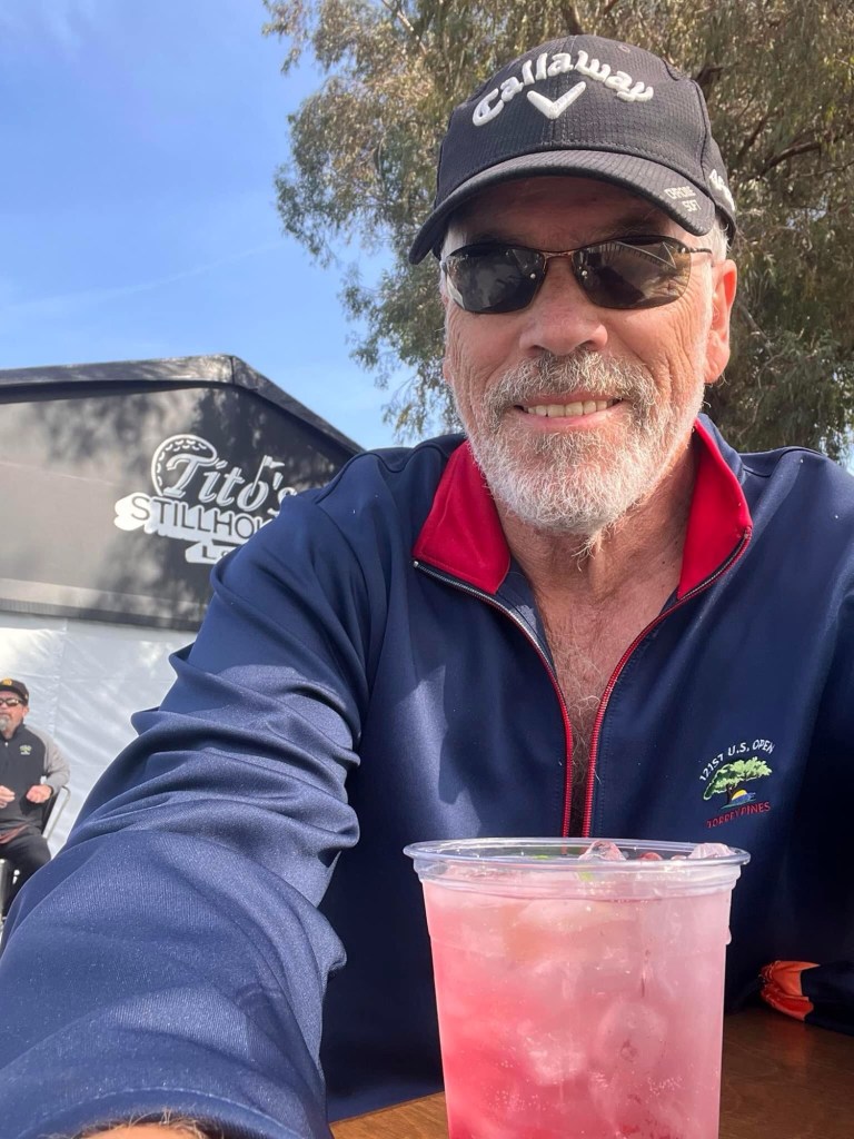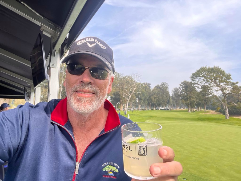 Maybe could squeeze in one more drink before heading back to first fairway for The Striped One . The 13th green in the distance appealed as did the Tequila Tent as we are close to Mexico after all. The beauty of being early in these tents does mean you can get a seat “green side” . Exhibit A. Less distance to fall too