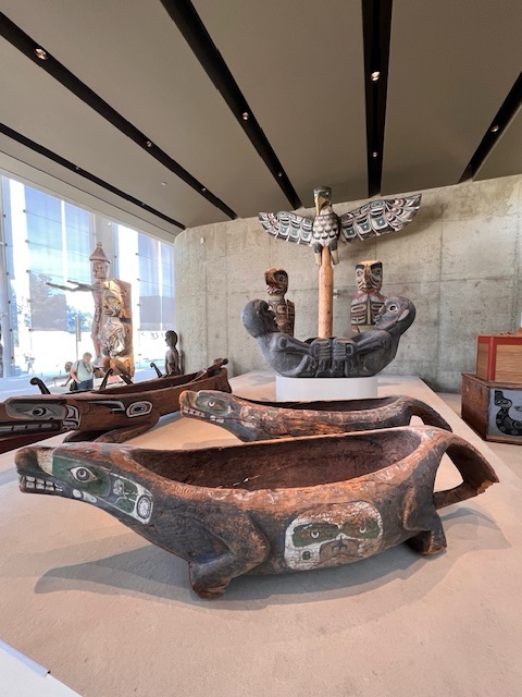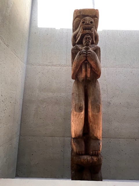 Then it was time for another plan. We are so efficient and adaptable we had already compressed 5 days of sights into 3 . We decided to walk the brownie off and head back to Denham Street and then 2 buses and a cut lunch to West Vancouver to check out the Museum of Anthropology on the UBC campus. Look, I wouldnβt walk over wet grass to go back but it was impressive if you like multiple wood carvings and garish clothes I guess .