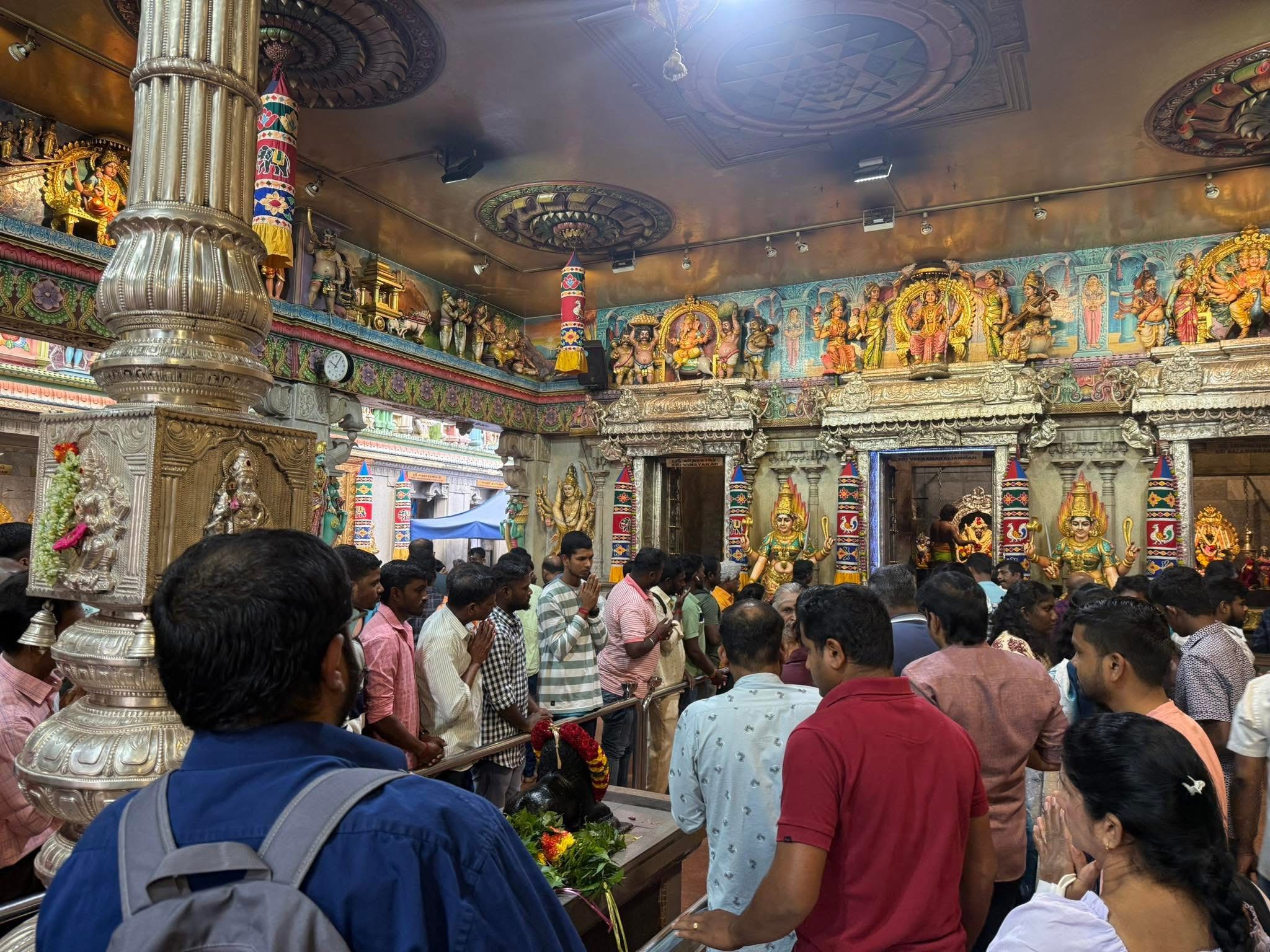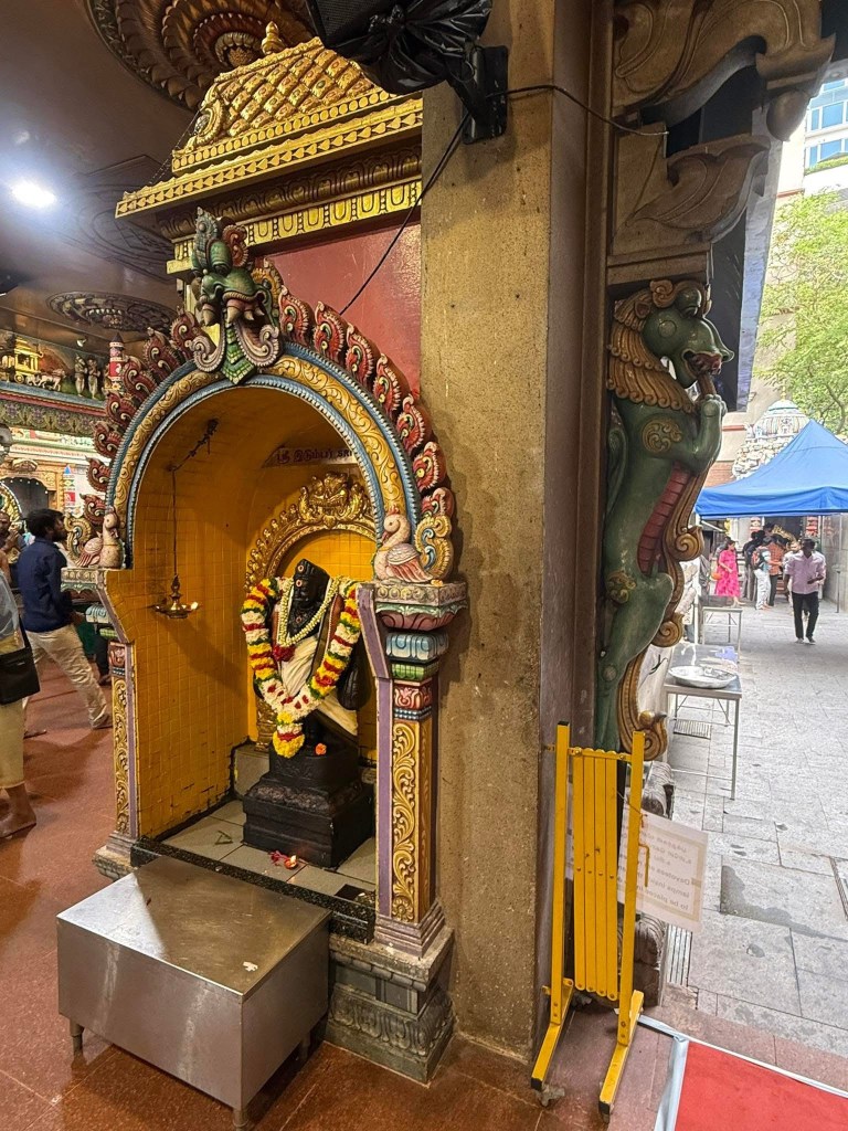 Then it was time for some kulcha and first up was Little India. Certainly different to the clean wide streets of Singapore. Very noisy too of course and the first of several impressive temples . I think there must be a cruise ship of Geriatrics landed as saw a group walking along street. The tour guide always has the umbrella so easy to pick.