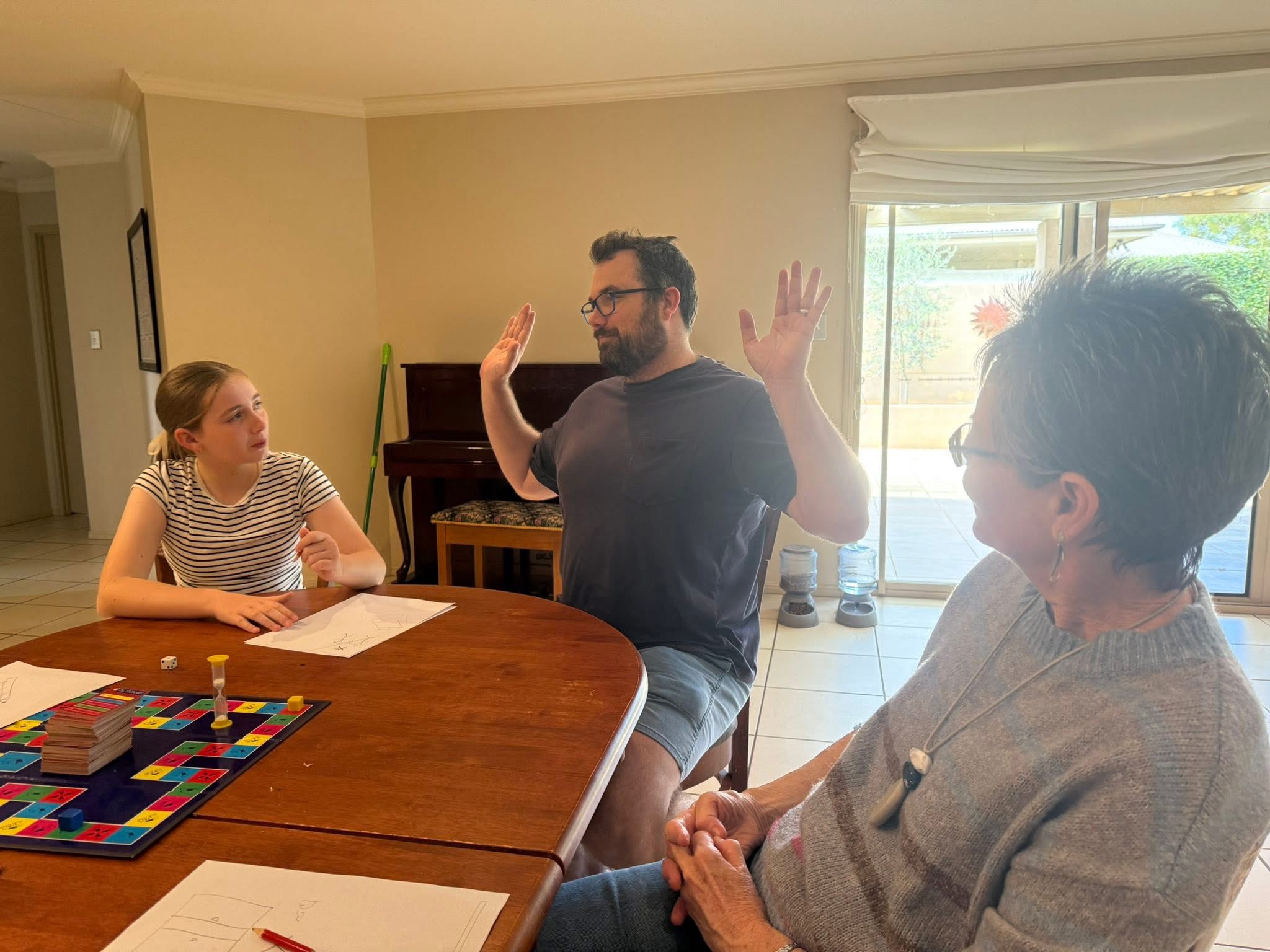 Unfortunately kids soccer was off due to overnight rain so we all headed over to Tonys for lunch. But first was the Pictionary Playoff to decide washing up duties . Great fun. Plates go in which cupboard then ?