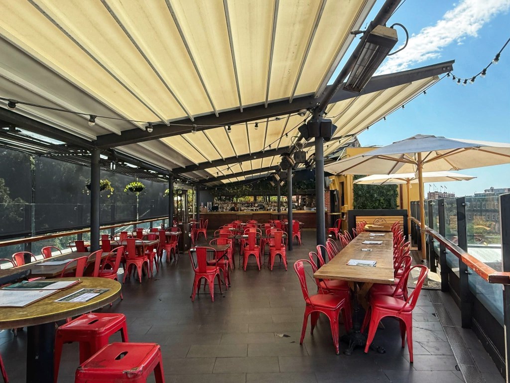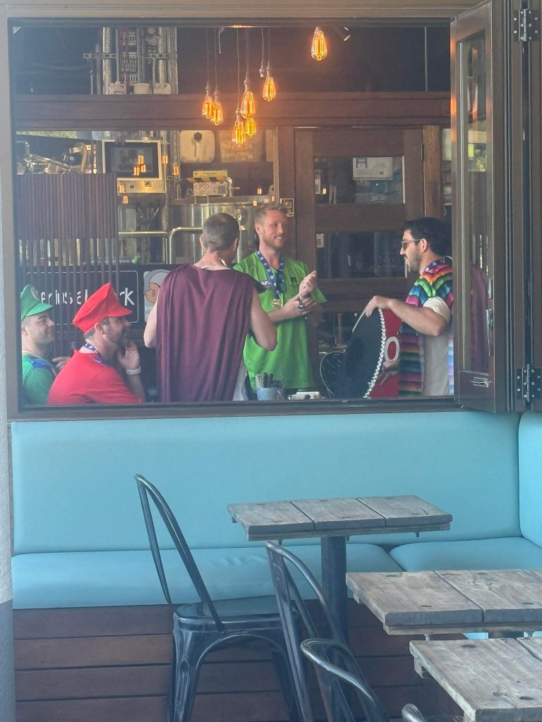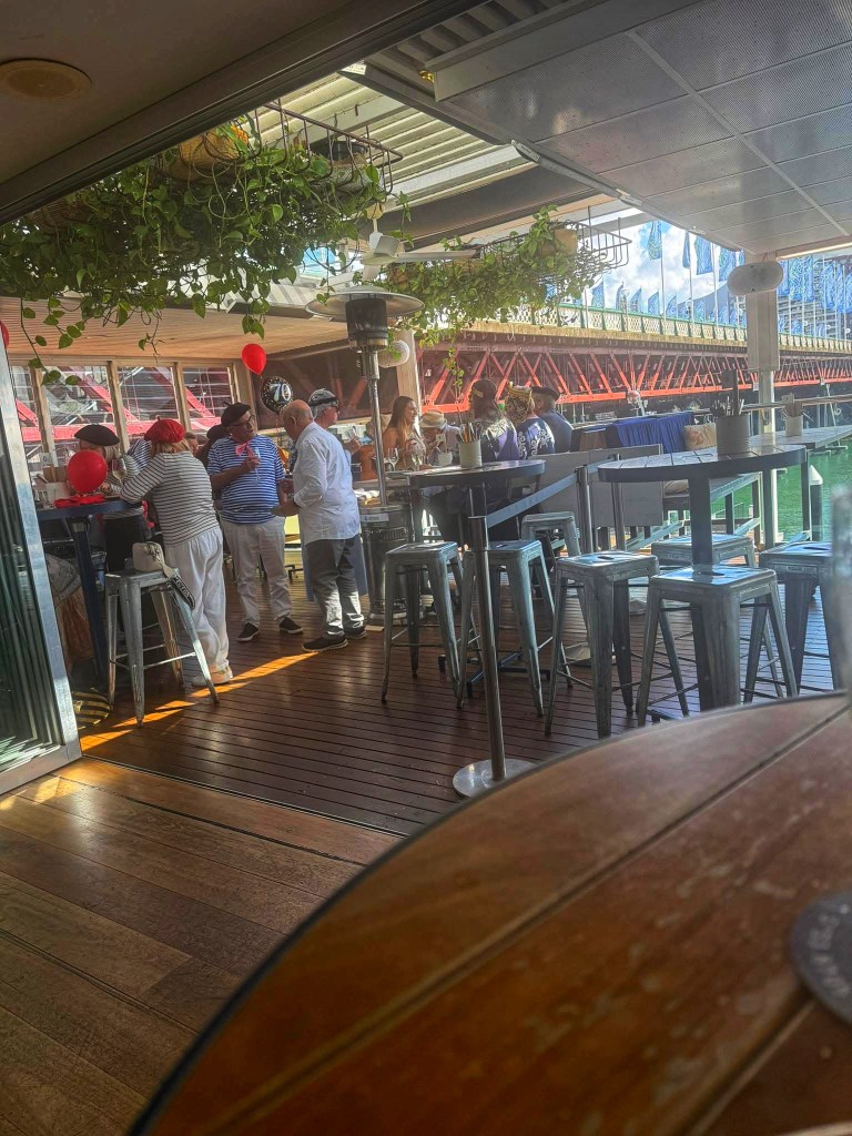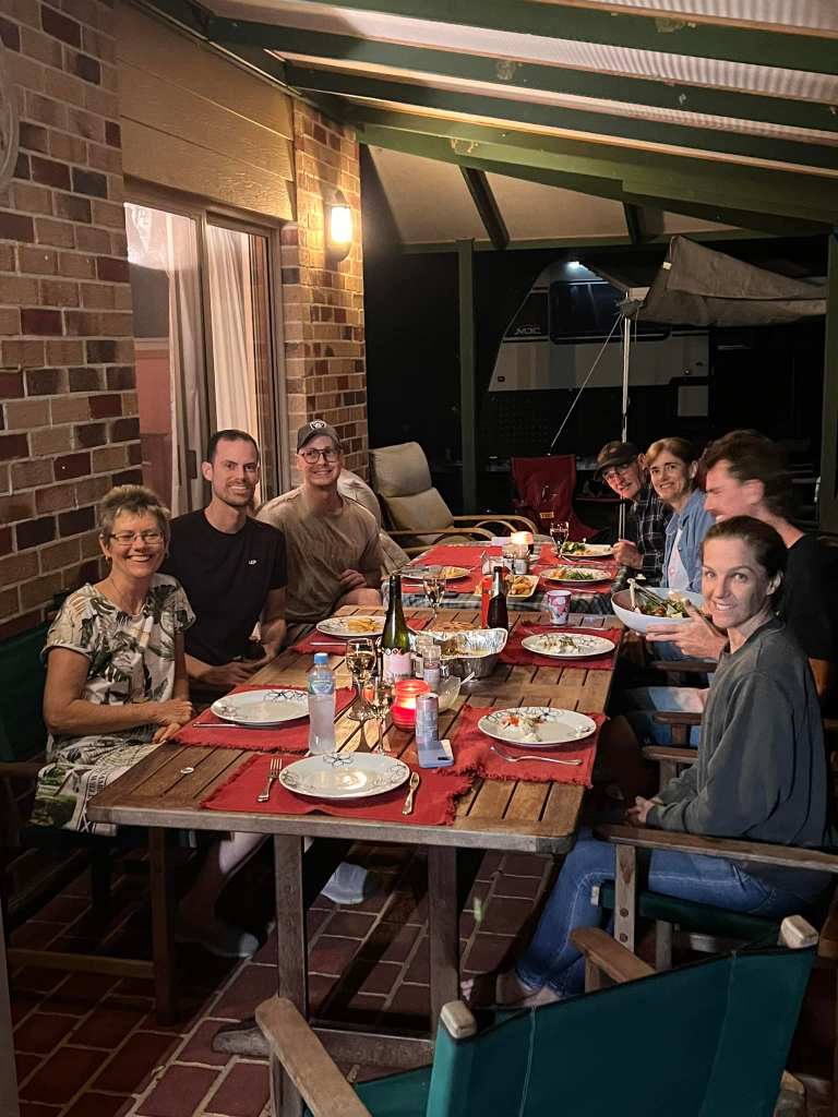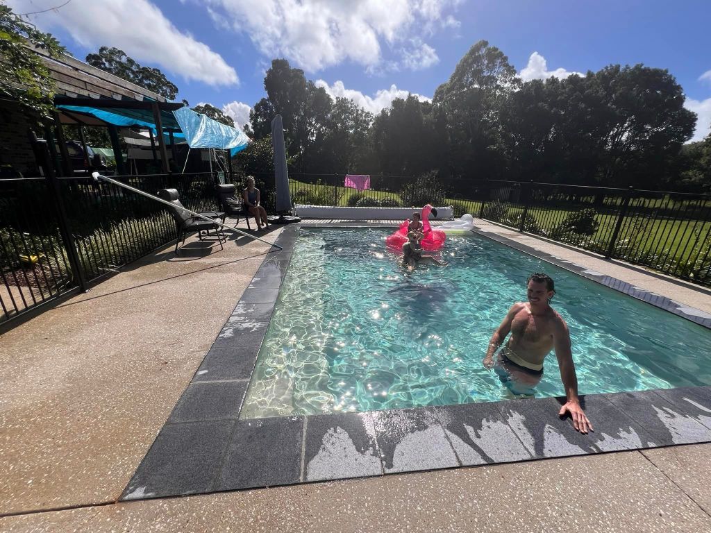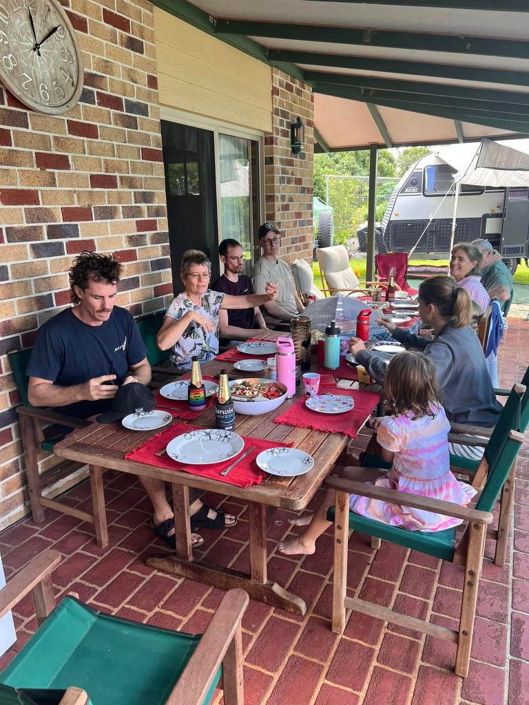 Everyone behaved themselves and retired for the night as the big day was still to arrive. Some rain during the night but woke again to a good day so went ahead with Plan A – get to that bloody chair before that dog! Another swim and then set up the outdoor areas – eating and drinking . This could catch on